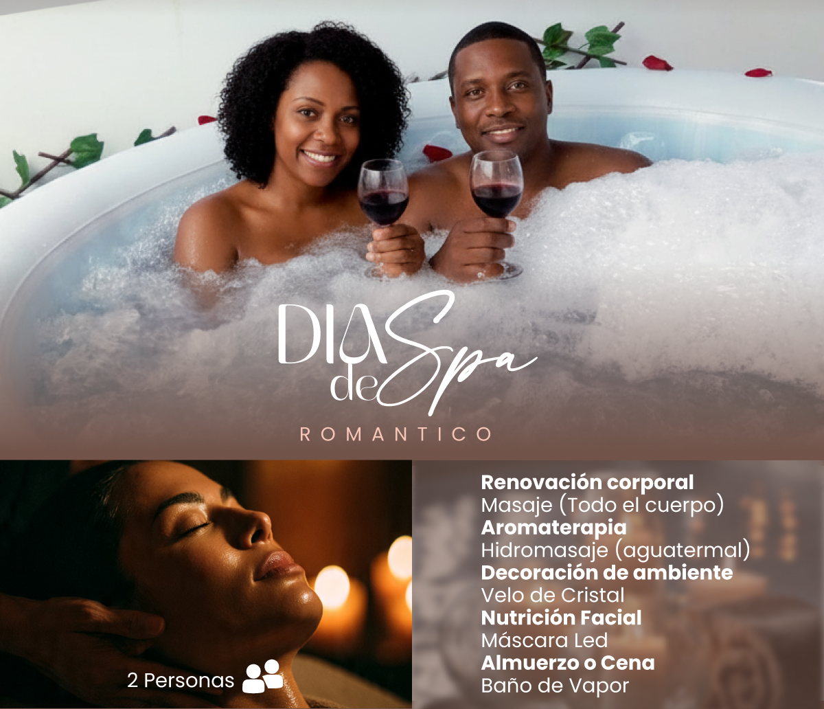 ● Spa de Parejas – Sesión diseñada para compartir momentos de relajación y bienestar en pareja.